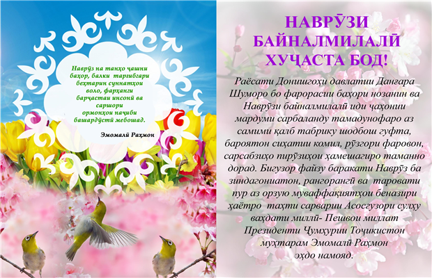 Таманниёти Ректори Донишгоҳи давлатии Данғара профессор Шоҳиён Нуралӣ Набот бахшида ба Соли нави мелодии 2022 Муфассал 10.01.2022