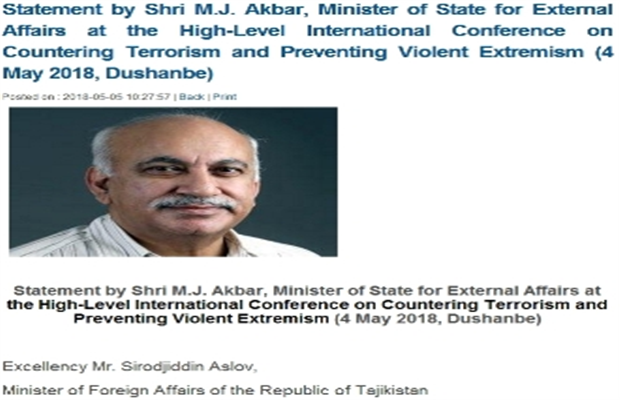 Statement by Shri M.J. Akbar, Minister of State for External Affairs of the Republic of India at the High-Level International Conference on Countering Terrorism and Preventing Violent Extremism on May 4, 2018, Dushanbe Муфассал 03.12.2018
